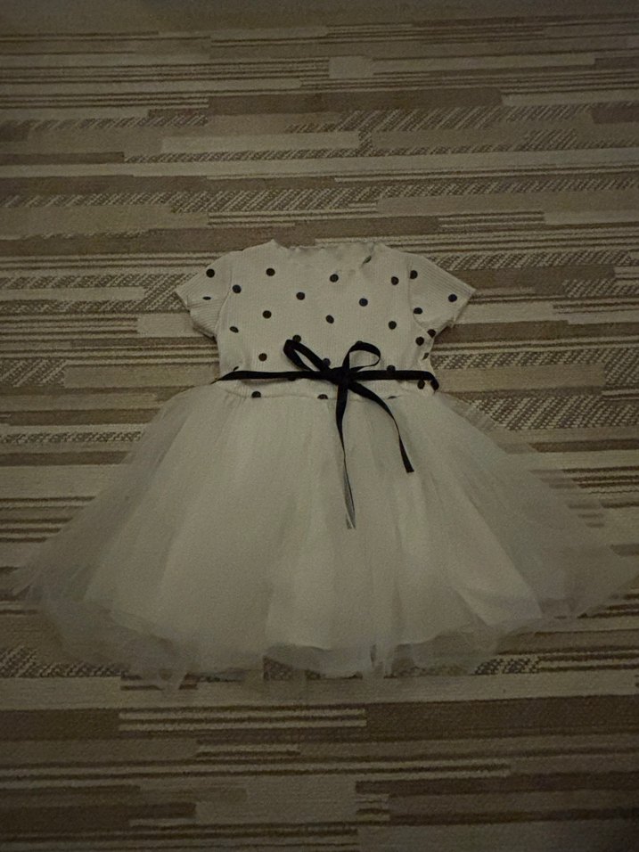 Beyaz puantiyeli, fırfırlı kız çocuk elbisesi, kruvaze yaka ve askılı kollu. Sentetik kumaştan, bohem tarzda, vücuda oturan kesim.