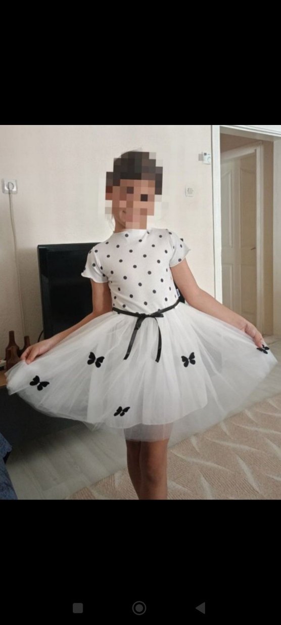 Kız çocukları için beyaz zemin üzerine siyah puantiyeli, kısa kollu ve kruvaze yakalı dar kesim elbise. Belinde fiyonk detayı ve etek kısmında kelebek desenleri bulunur.