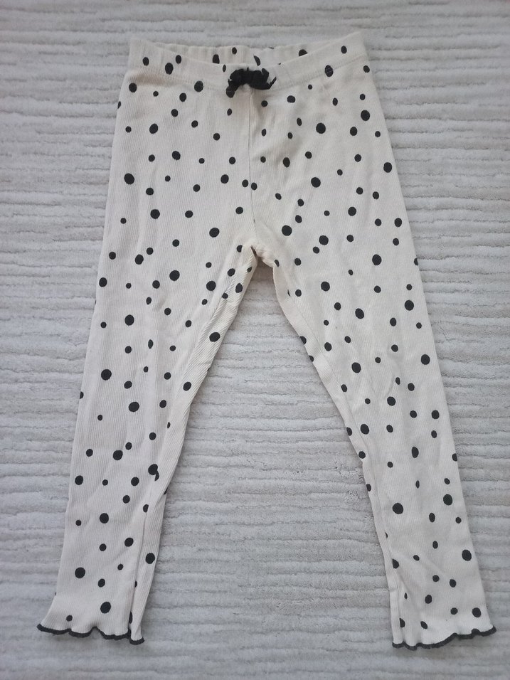 Beyaz pamuklu kız çocuk taytı, gri puantiyeli ve etek kısmında fırfır detaylı. Rahat ve yumuşak kumaş, sokak modasına uygun. Üründe herhangi bir benzeri kusur bulunmamaktadır.