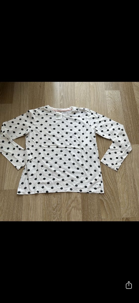 Pamuklu kumaştan yapılmış, uzun kollu, yuvarlak yakalı, bol kesim kız çocuk beyaz ve gri puantiyeli bluz. Düğme detayları bulunur.