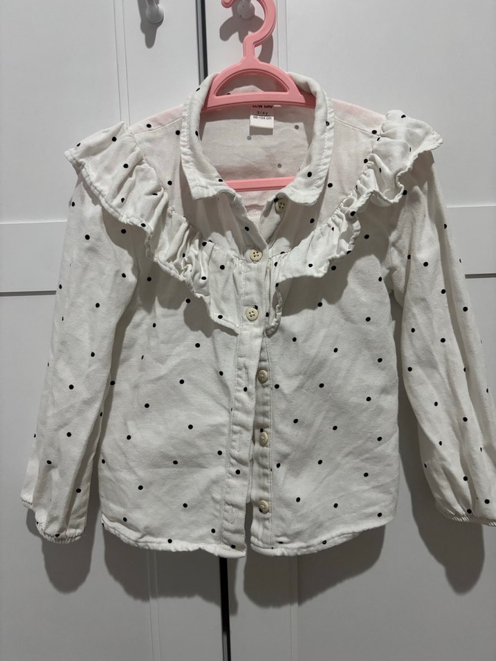 Kız çocuk için beyaz pamuklu gömlek, uzun kollu, yakalı, düğmeli, bol kesim, puantiyeli ve fırfırlı detaylıdır.