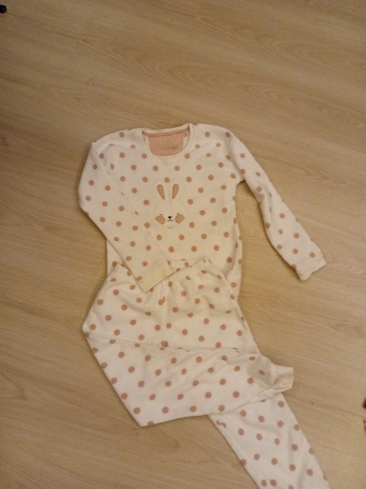 Uzun kollu, bisiklet yaka kız çocuk pijaması. Beyaz zemin üzerinde pastel tonlarda puantiyeli ve örgü tavşan desenli. orjinal black space markası 7 8 yaş