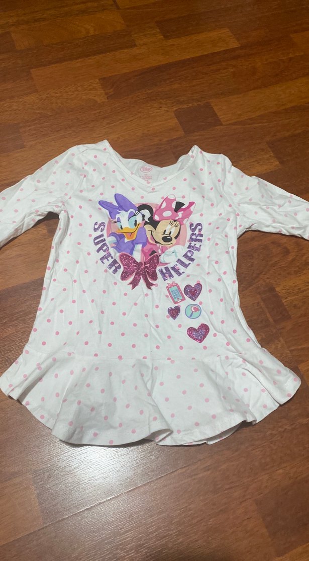 Pembe puantiyeli beyaz pamuklu, V yaka, uzun kollu kız çocuk tişörtü. Alt kısmında fırfırlı ve Minnie ile Daisy baskılıdır. Trend sokak stili için uygun.