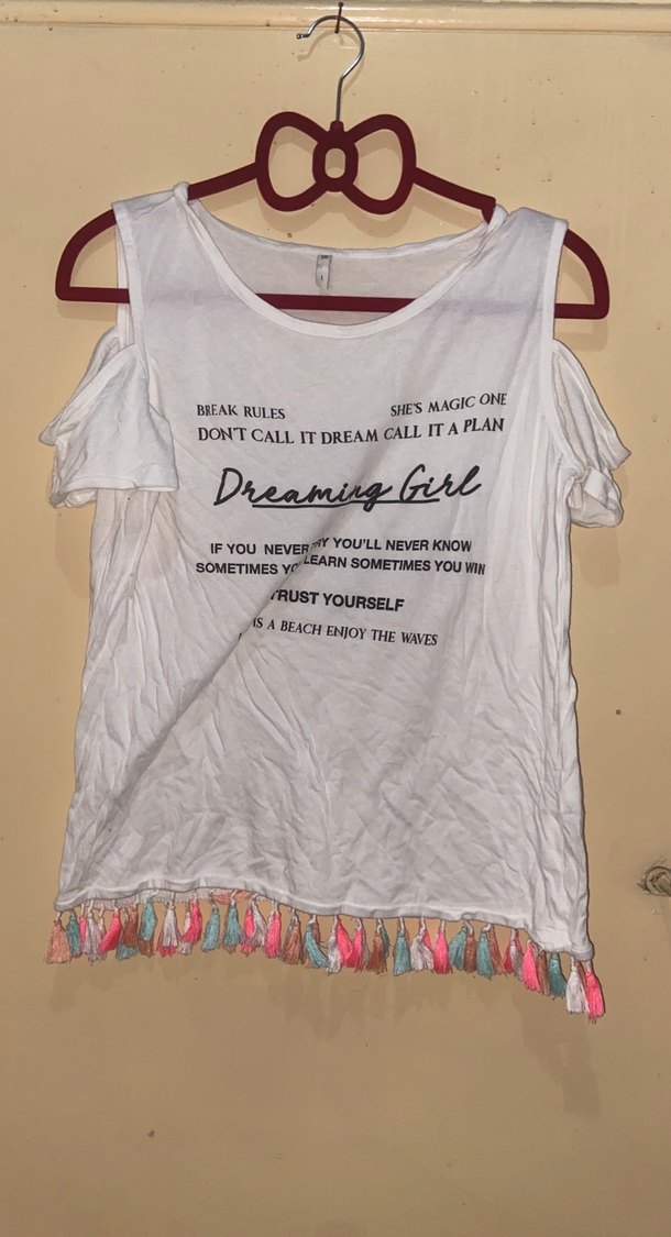 Beyaz pamuklu, kısa kollu, straplez tişört. Püskül detaylı, bol kesim ve baskılı yazılar içerir. Bohem tarz için uygundur.