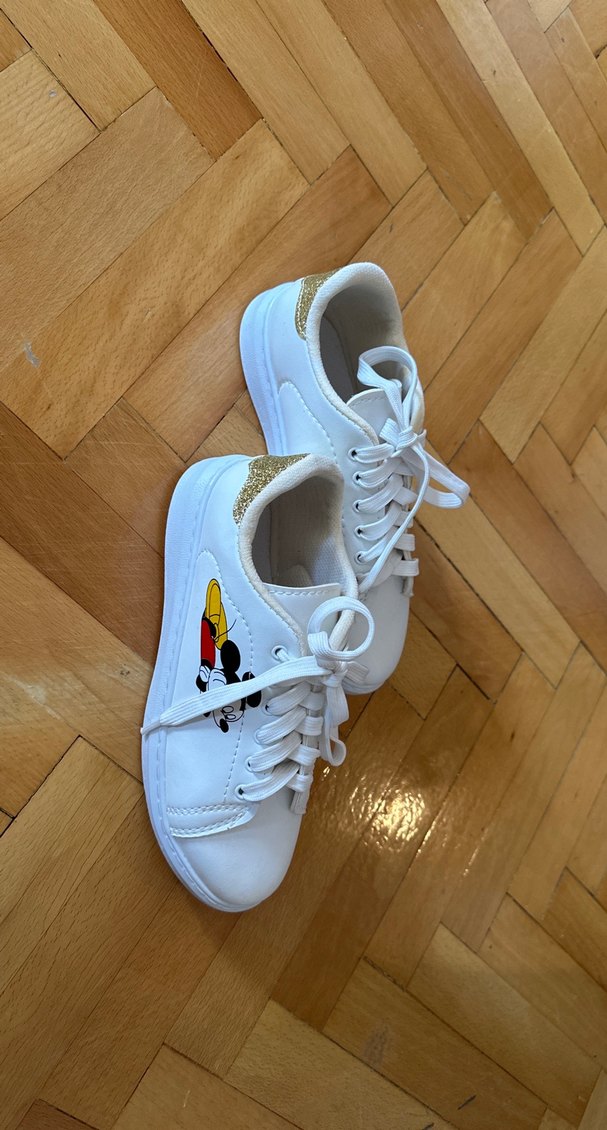 38 numara Beyaz renkli kız çocuk spor ayakkabısı, renkli baskılı tasarıma ve kauçuk tabana sahip. Bağcıklı ve cırt cırtlı, sokak stili için uygun.