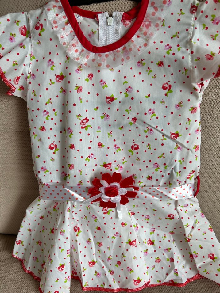 Beyaz kumaş üzerine renkli çiçek desenleri, kısa kollu, yakalı ve fırfırlı detaylı kız çocuk elbisesi. Belde çiçekli kemer bulunur.
