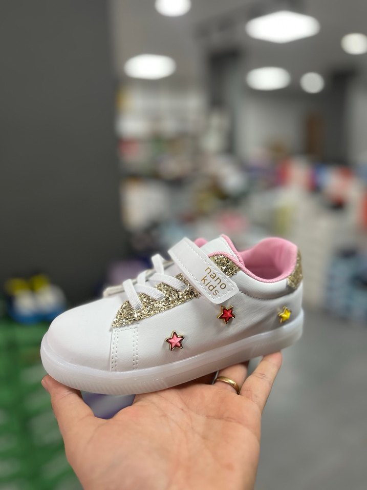 Beyaz kız çocuk spor ayakkabısı, ışıklı renkli yıldız desenleri ve sim detaylarıyla. Cırt cırtlı kapanış ve kauçuk tabanlı, 25-35 arası numaraları mevcuttur trend sokak tarzı için uygun. ⭐
