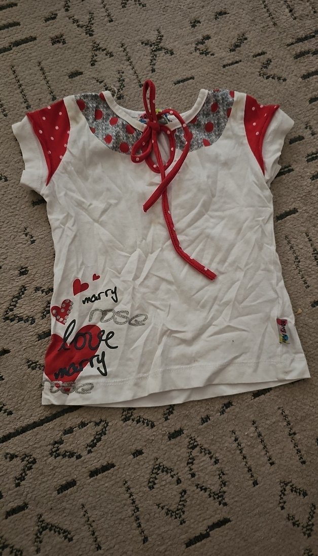 Kısa kollu, bağcıklı halter yaka ve renkli baskılı beyaz kumaştan, dar kesim kız çocuk tişörtü. ❤️