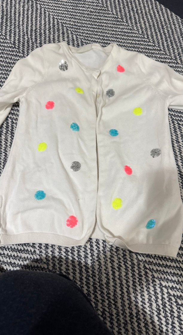 Pamuk kumaştan, uzun kollu ve bol kesim beyaz renkli hırka. Renkli pastel tie-dye desenli ve düğmeli, sokak stili için uygun.