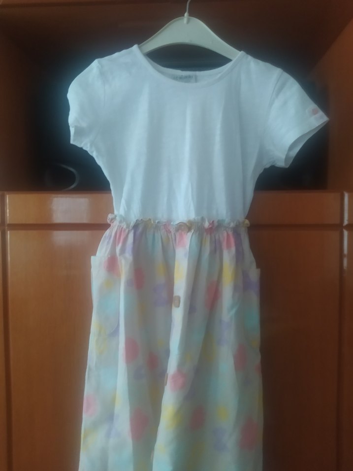 Kız çocuk elbise, beyaz kısa kollu ve yuvarlak yakalıdır. Alt kısmı pastel tonlarda tie-dye desenli ve fırfırlıdır, yumuşak sentetik kumaştan yapılmıştır. Trend sokak stili için uygundur.