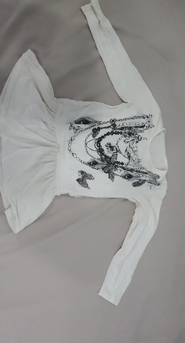 Kız çocukları için uzun kollu, yuvarlak yakalı, bol kesim tişört. Yumuşak sentetik kumaştan, gri bohem desenli ve fırfırlı detaylı.