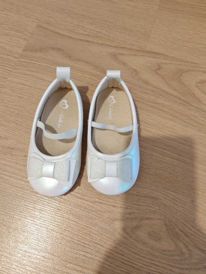 Parlak beyaz kız çocuk babetleri, tokalı bant ve fiyonk detayına sahip, rahatlık için düz kauçuk tabanlı. bir kaç kez temiz kullanıldı herhangi. bir kusuru yok 21 numara