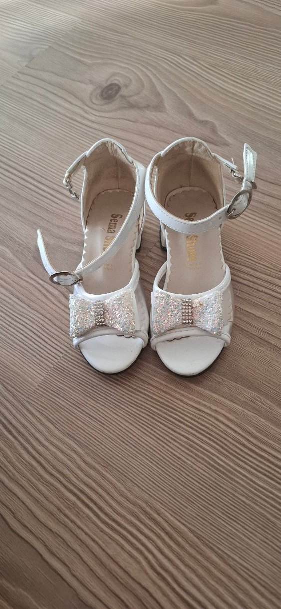 Kız çocukları için beyaz, parlak rugan malzemeden, tokalı kayış ve fiyonk detaylı, yumuşak kauçuk tabanlı klasik desenli babet.