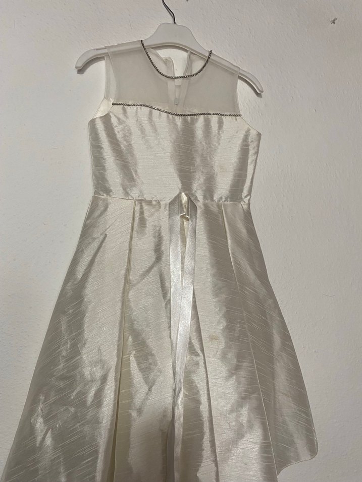 Beyaz saten kumaştan, straplez yakalı ve pliseli etekli kız çocuk elbisesi. Kolsuz ve vücuda oturan modern klasik tarzda, parlak görünümlü. ✨ marka temsilidir