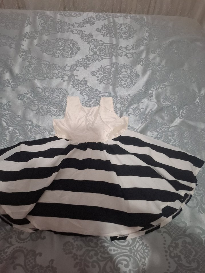 Askılı kolları ve kayık yaka detayıyla, sentetik kumaştan yapılmış, zebra desenli ve fırfır detaylı, beyaz ve siyah tonlarında kız çocuk elbisesi. Astar ve tül kabartmalı abiye tarzda. 3-4 yaş uyumlu.