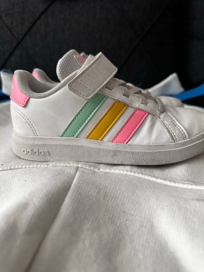Kız çocukları için beyaz sneaker, pastel renk şeritler ve kolay kullanım için cırt cırtlı bant içerir. Baskılı desenli ve kauçuk tabanlıdır, sokak tarzına uygundur.