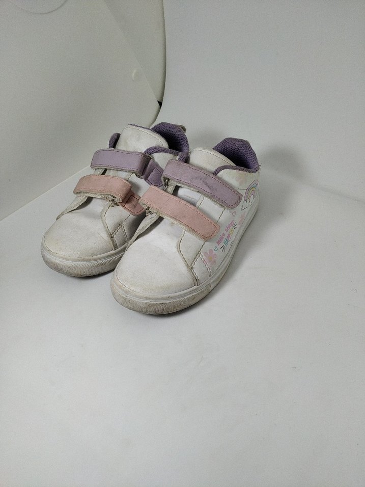Beyaz kız çocuk sneaker, pastel renkli velcro bantlara ve kauçuk tabana sahip, trendy casual sokak stili için uygun, desensiz tasarım.