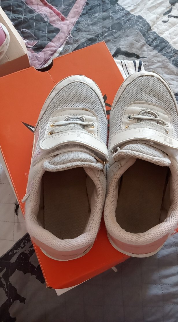Beyaz kız çocuk spor ayakkabısı, bantlı ve kauçuk tabanlıdır. Trendy casual sokak stiline uygundur ve desensizdir. beyaz ama kullanıma bağlı deformeler mevcut. fiyata yansıttım