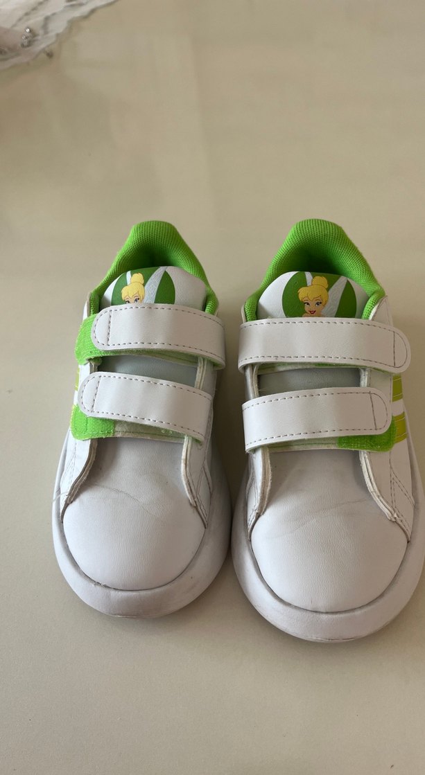 Beyaz kız çocuk spor ayakkabısı, renkli baskılar ve yeşil detaylarla. Velcro bantlı ve kauçuk tabanlı, rahat sokak stili ayakkabı adidas 2/3 kez anca giyildi tertemiz sıfır ayarında