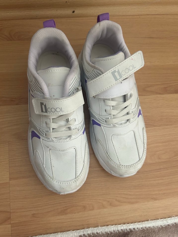 Beyaz renkli, velcro bantlı kız çocuk spor ayakkabısı, kauçuk tabanlı, sokak stiline uygun.
