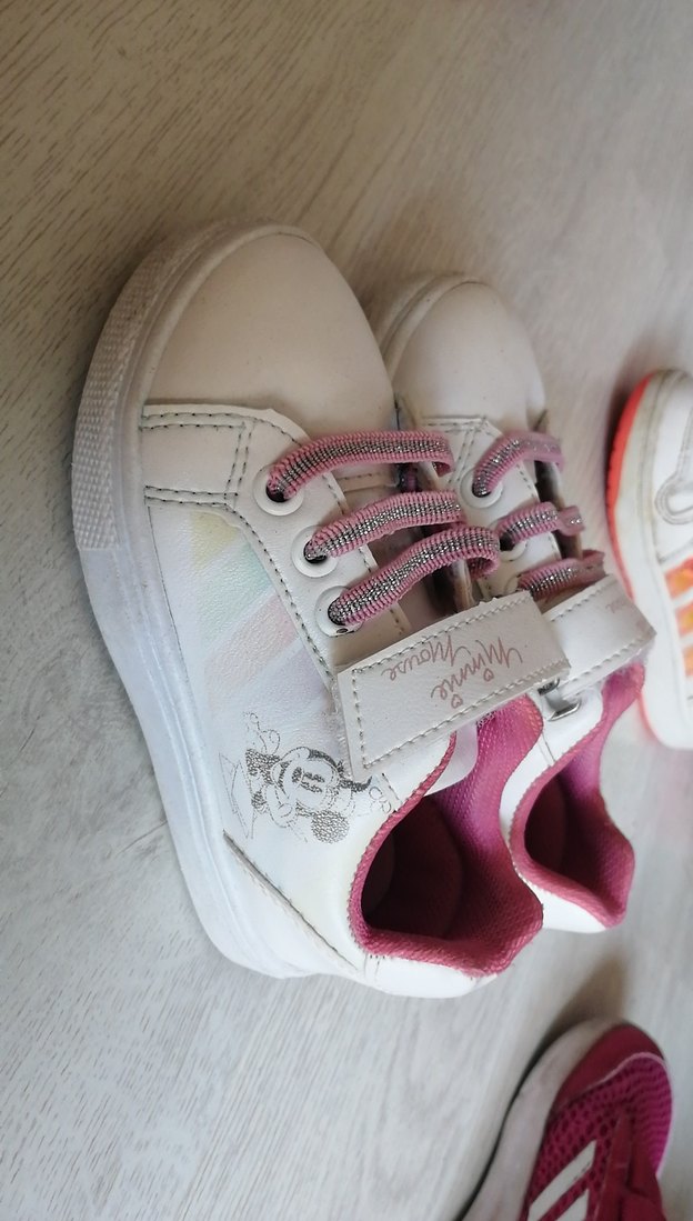 Beyaz renkli, pastel pembe detaylı kız çocuk spor ayakkabısı. Velcro bantlı ve kauçuk tabanlıdır, rahat sokak stili için uygundur.