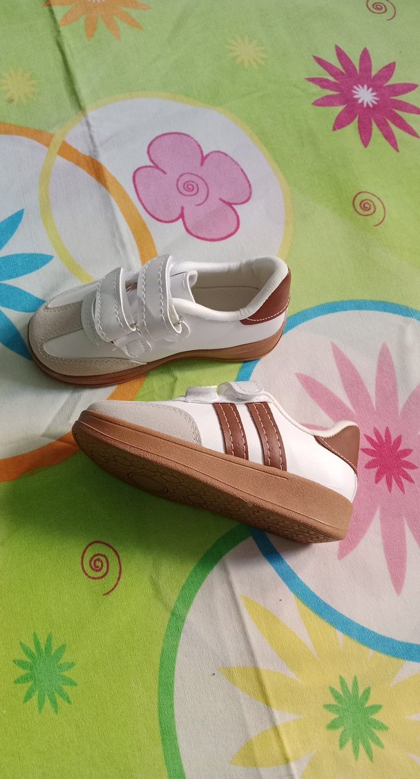 Beyaz renkli, kahverengi detaylı kız çocuk spor ayakkabısı. Velcro bantlı ve kauçuk tabanlı, sokak stiline uygun.