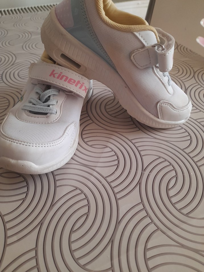 Beyaz kız çocuk spor ayakkabısı, gri desenli ve Velcro kapamalı. Kauçuk tabanlı, "kineti" yazılı detaylı, trend sokak stili için uygun.