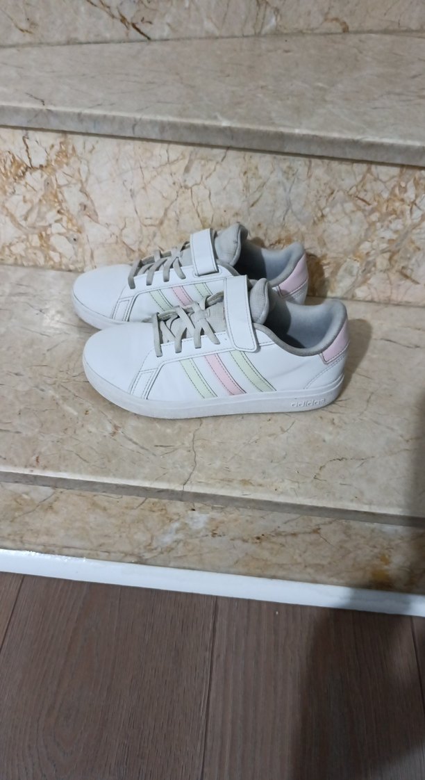 Beyaz kız çocuk spor ayakkabısı, pastel renkli çizgiler ve velcro bantlı, kauçuk tabanlı, street wear tarzında.