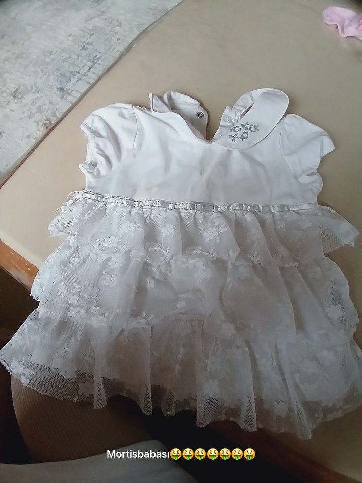 Kız çocukları için kısa kollu, straplez ve kat kat fırfırlı, yumuşak sentetik kumaştan yapılmış beyaz elbisedir. pembe tişört ve tatlar birlikte satışta tişörtle biraz leke var resimde belirtildi beyaz fırfırlı üst lcw dır