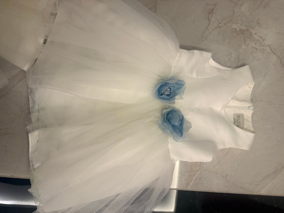 Kolsuz, straplez beyaz elbise, oturan üst kısmı ve tül eteğiyle, açık mavi çiçek detayları ve fırfır süslemeleriyle modern bir tarz sunar.