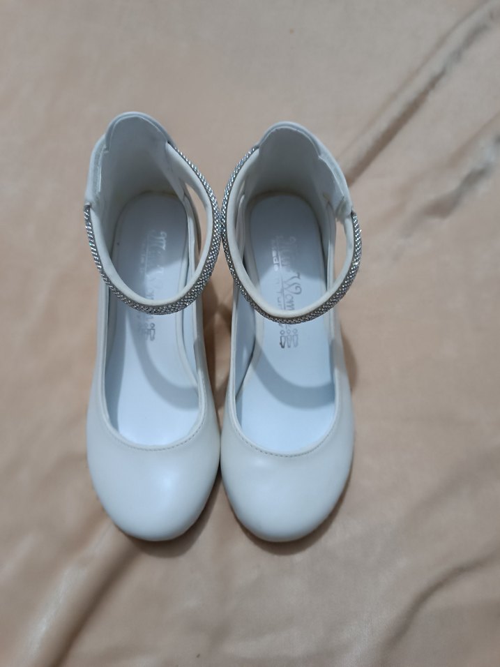 Kız çocukları için beyaz topuklu ayakkabı . Modern klasik tarzda, şık ve rahat bir model.