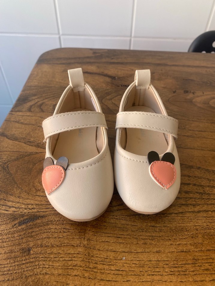 Beyaz renkte, tokalı bantlı ve uçlarında nakışlı kalp detayları bulunan kız çocukları için yumuşak kauçuk ayakkabı