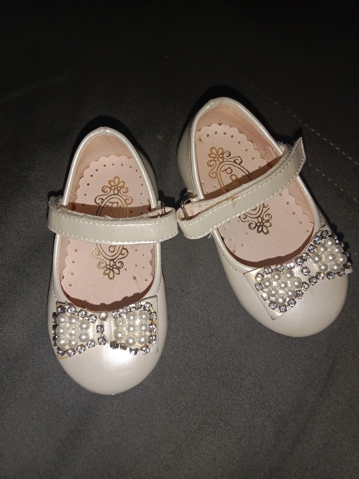Beyaz kız çocuk babeti, tokalı bant ve işlemeli detaylara sahip. Modern klasik tarzda, inci süslemeli fiyonk ile tasarlandı.