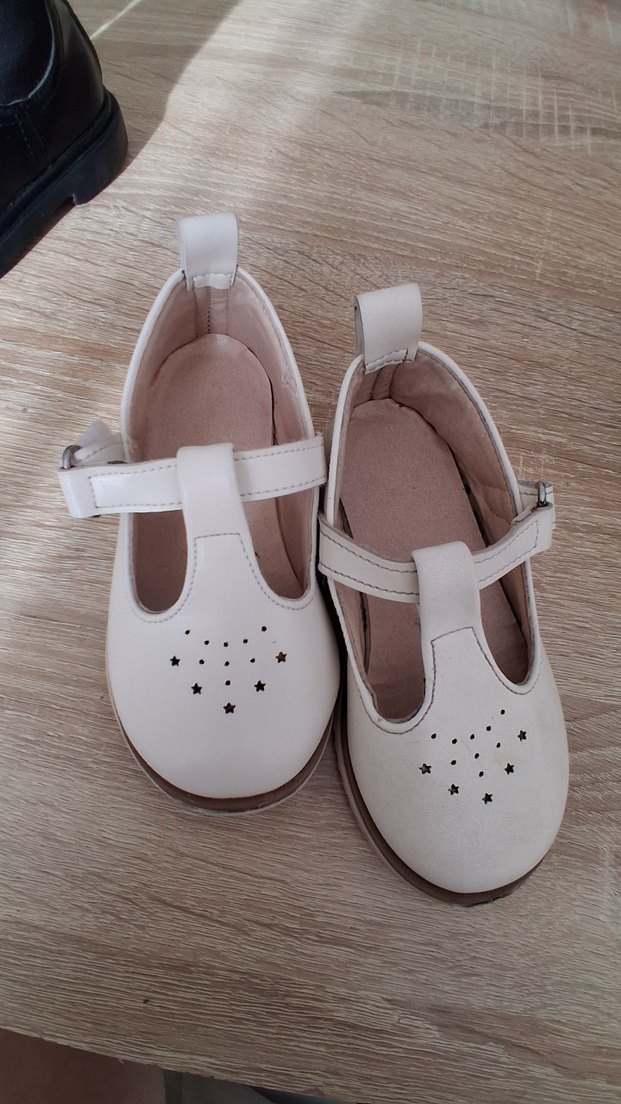 Beyaz kız çocuk babet ayakkabı, tokalı kayışlı ve burunda yıldız desenli delikler bulunur. Lastik malzemeden yapılmıştır, sade ve düz tasarım.