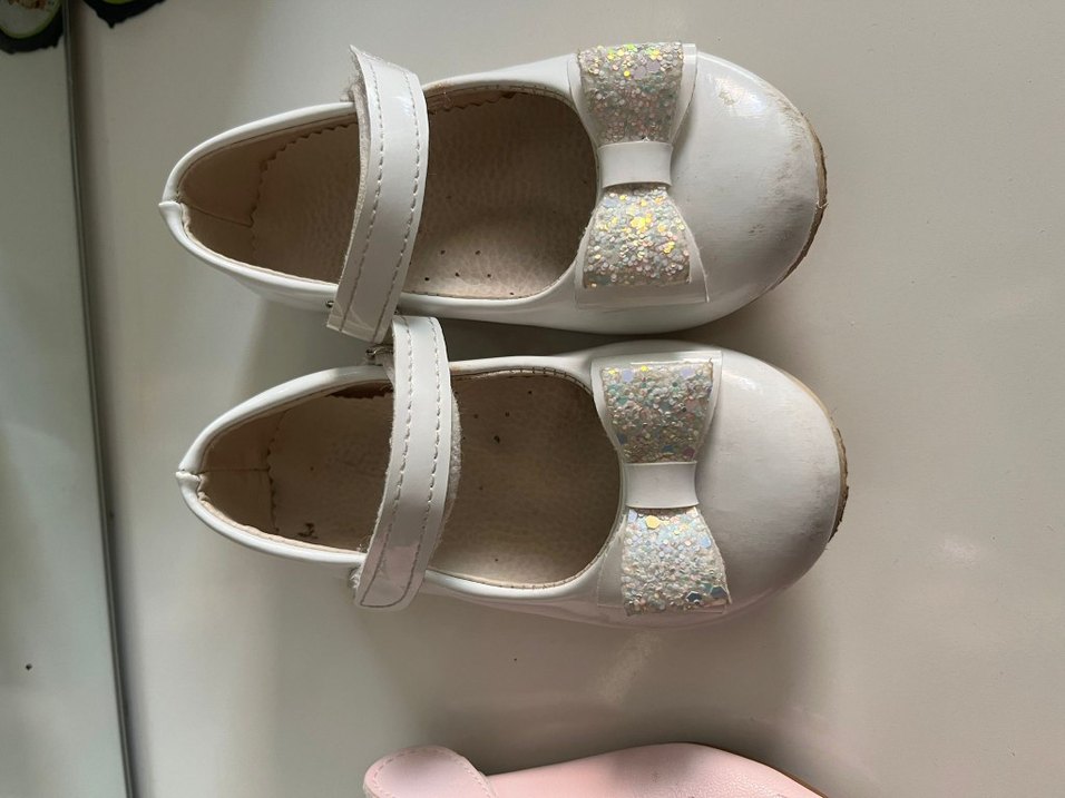 Tokalı askıya sahip, ön kısmında simli fiyonk detaylı beyaz kız çocuk babetleri. Kauçuk malzemeden yapılmıştır.✨temiz kullanılmıştır sadece ön kısmında biraz çizilme mevcut oda kullanıma engel değil