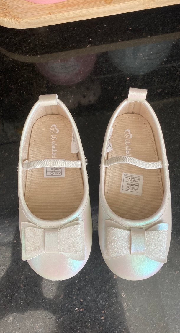 Beyaz renkte, tokalı kız çocuk babet ayakkabı. Lastik malzemeden, sade tasarımlı ve fiyonk detaylı, günlük kullanıma uygun bir defa düğünde giyildi hiçbir aorunu yok yeni gibi