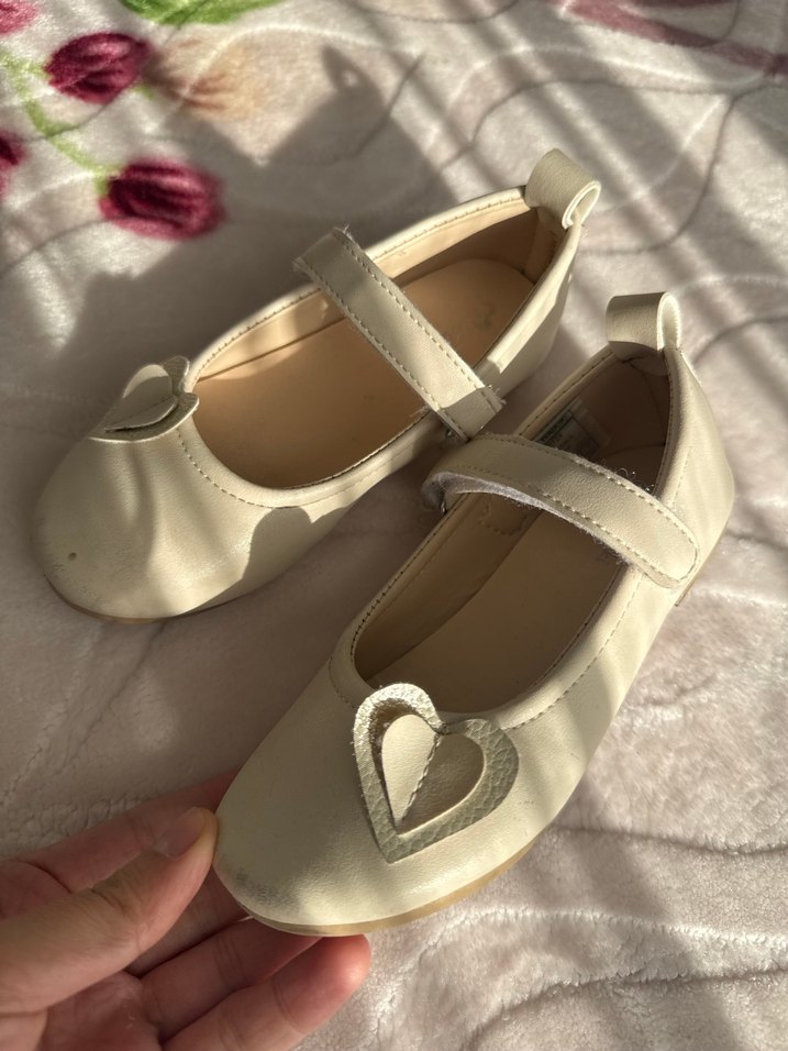 Kız çocukları için beyaz, pastel tonlu, tokalı ve kauçuk malzemeden yapılmış babet ayakkabılar. Kalp şeklinde tokası bulunur, desensiz sade tasarım.