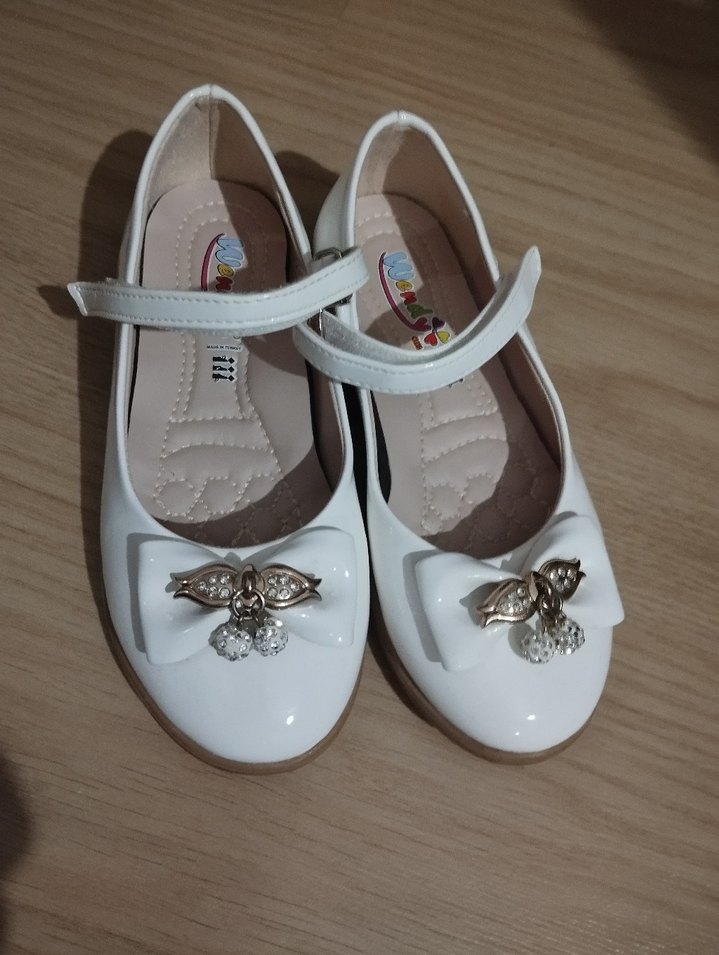 Beyaz tokalı bantlı kız çocuk babetleri, şık fiyonk detaylı baskılı tasarıma sahip. Pürüzsüz kauçuk malzemeden, klasik ve geleneksel tarzda.
