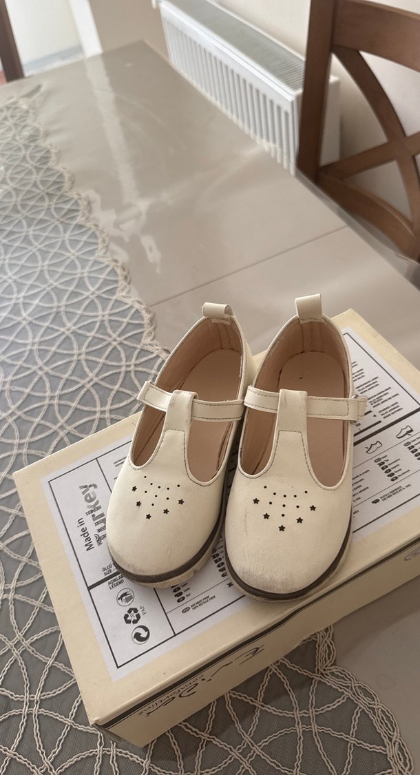 Kız çocuklar için beyaz babet ayakkabılar, tokalı bant ve yıldız desenli delikli detaylarla sade ve klasik tasarıma sahiptir.