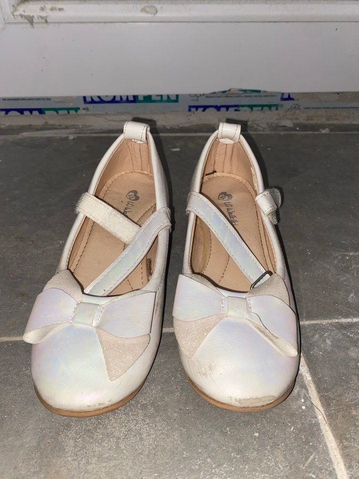 Beyaz, tokalı kız çocuk babet ayakkabısı. Kauçuk malzemeden, sade tasarımlı ve fiyonk detaylı, klasik şıklık ve günlük sokak stili için uygundur.