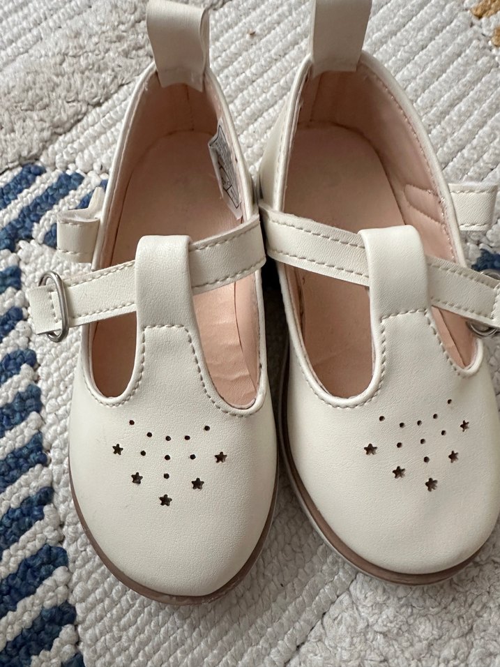 Kız çocukları için beyaz renkte, tokalı bantlı ve yumuşak kauçuk malzemeden yapılmış babet ayakkabılar. Önünde küçük yıldız desenli delikler bulunur.