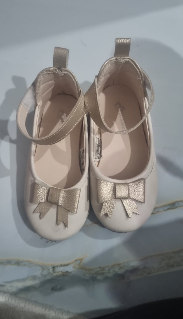 Kız çocukları için tokalı bantlı ve dekoratif kurdele detaylı beyaz babet ayakkabı, rahat ve dayanıklı kauçuk tabanlı. Modern klasik tarzda.