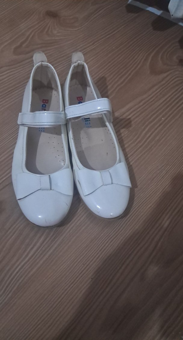 Kız çocukları için tokalı beyaz babet ayakkabı, burunda fiyonk detayı ve lastik malzemeden yapılmıştır. Sokak stili için sade ve temel tasarımda.