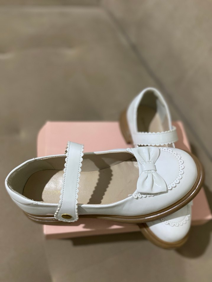 Kız çocukları için beyaz tokalı babet ayakkabı, dayanıklı kauçuk malzemeden ve klasik tasarımlı, üstünde dekoratif fiyonk bulunmaktadır.Hiç bir sorunu yok 1 kere giyildi sadece etiketi yok okadar temiz ve defosuz