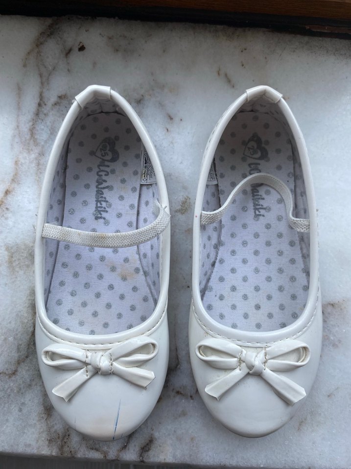 Kız çocukları için tokalı beyaz kauçuk babetler, önünde fiyonk detayı bulunur. İç kısımda gri puantiyeli sade tasarım yer alır. 1-2 kere ancak kullanıldı. Düğün dernek için kurtarıcı. Sol ayak ucunda mavi çok dikkat çekmeyen bir çizik var sildim çıkmadı başka bir kusuru yok