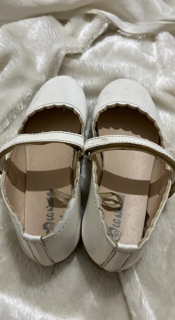 Kız çocuklar için beyaz babet ayakkabılar, tokalı bant ve düz yüzeye sahiptir. Klasik ve geleneksel tarzda, pastel renkte sade bir görünüme sahiptir.