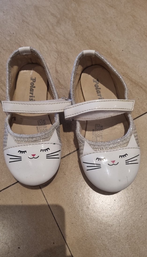 Beyaz tokalı kız çocuk babet ayakkabı, sevimli kedi yüzü ve gri detaylarla. Kauçuk malzemeden yapılmıştır.