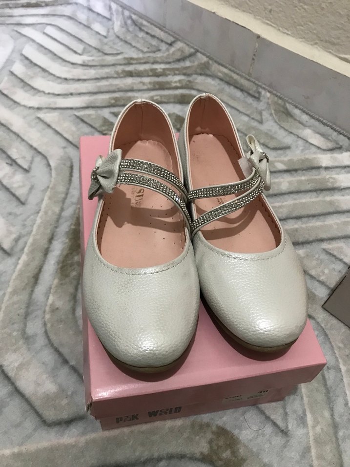 Kız çocukları için beyaz tokalı, desen içermeyen düz yüzeye sahip babet. Dayanıklı kauçuktan klasik ve sade tasarım.