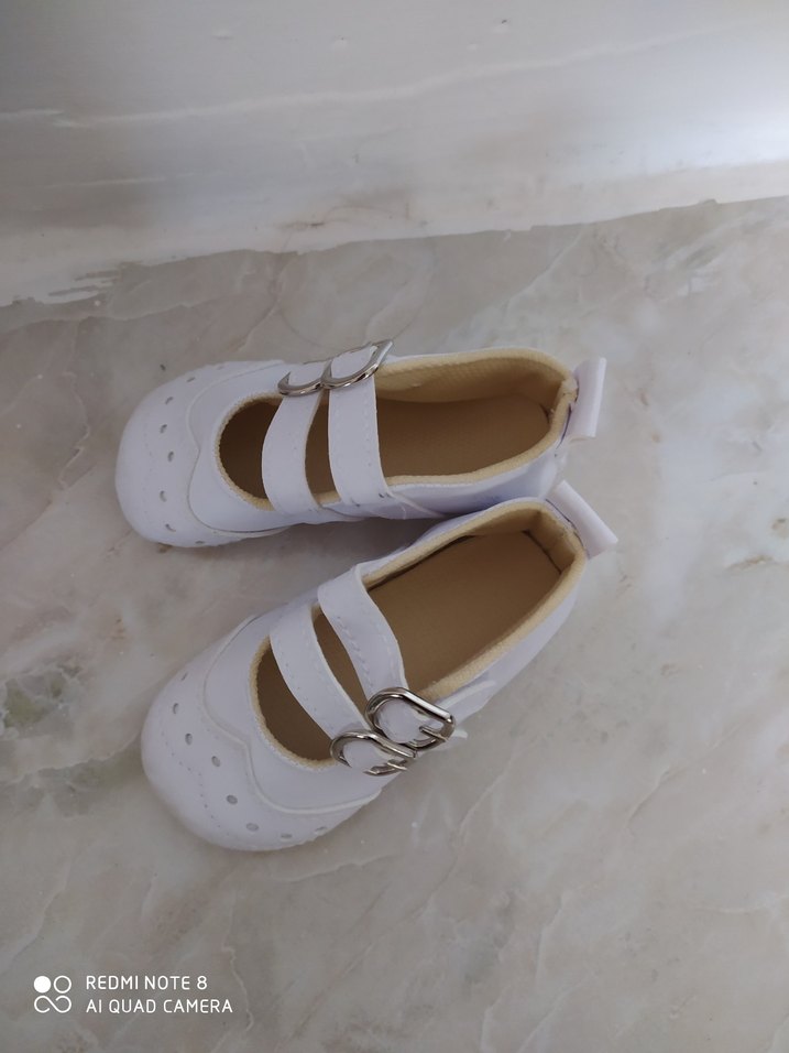 Kız çocukları için beyaz, çift tokalı, lastik malzemeden yapılmış düz babet ayakkabılar. Desensiz, hafif renkli ve klasik tarzda.