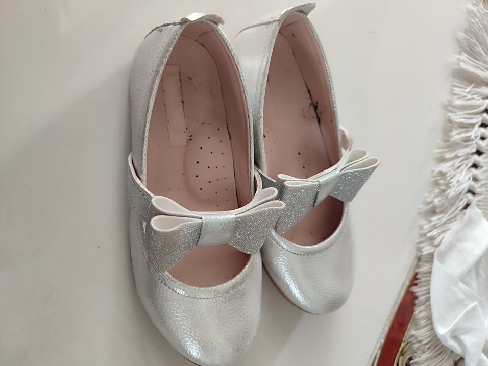 Beyaz renkli, tokalı ve fiyonk detaylı kız çocuk babet ayakkabısı. Gri ışıltılı kauçuk malzemeden yapılmış, çağdaş bir stile sahiptir.